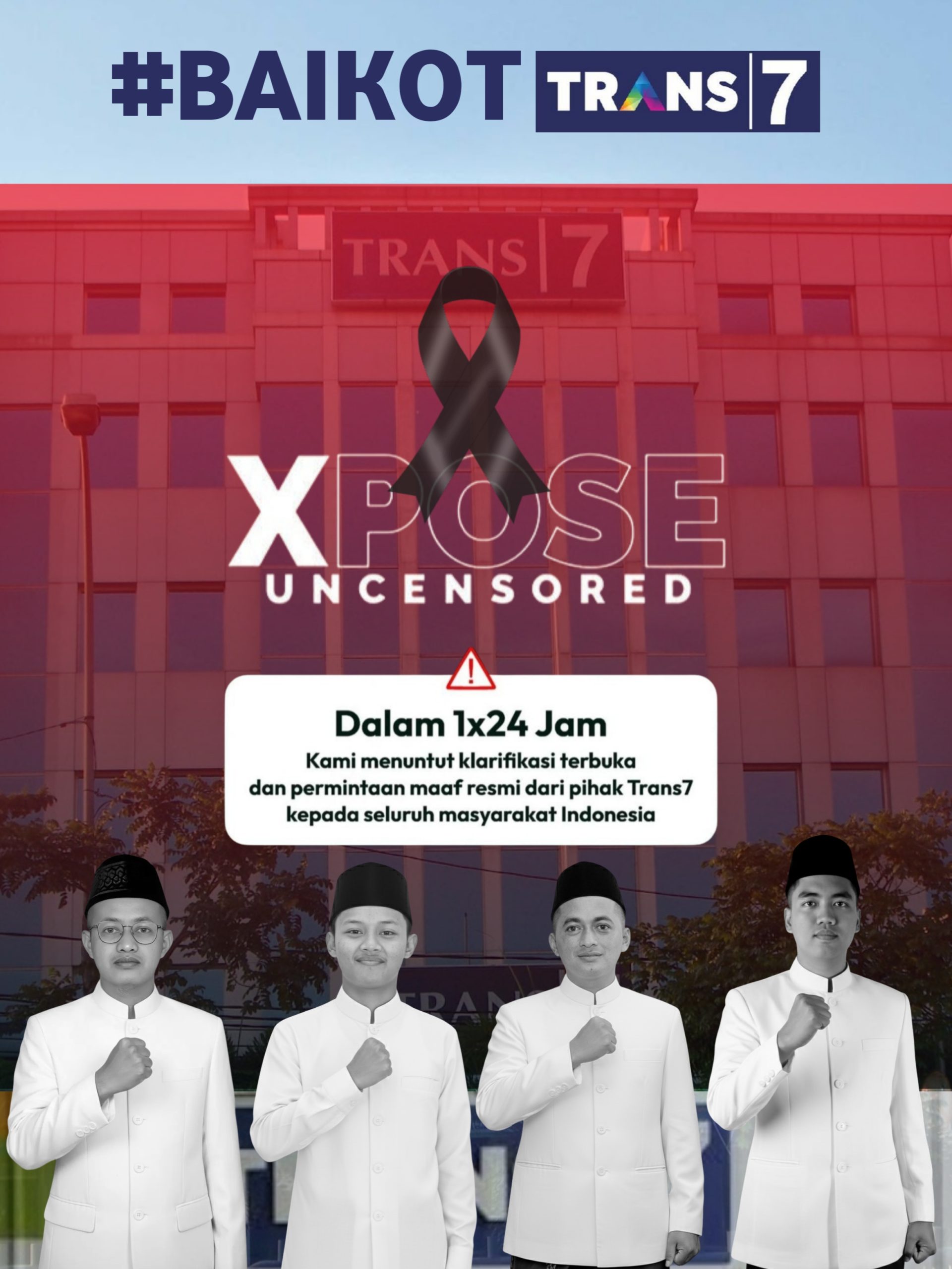 “Kami meminta Trans7 untuk segera memberikan klarifikasi terbuka dan permintaan maaf secara resmi kepada seluruh masyarakat Indonesia, khususnya kepada para ulama dan santri. Jika tidak, kami bersama masyarakat pesantren akan menyerukan aksi nasional untuk memboikot tayangan-tayangan Trans7,” tegasnya.